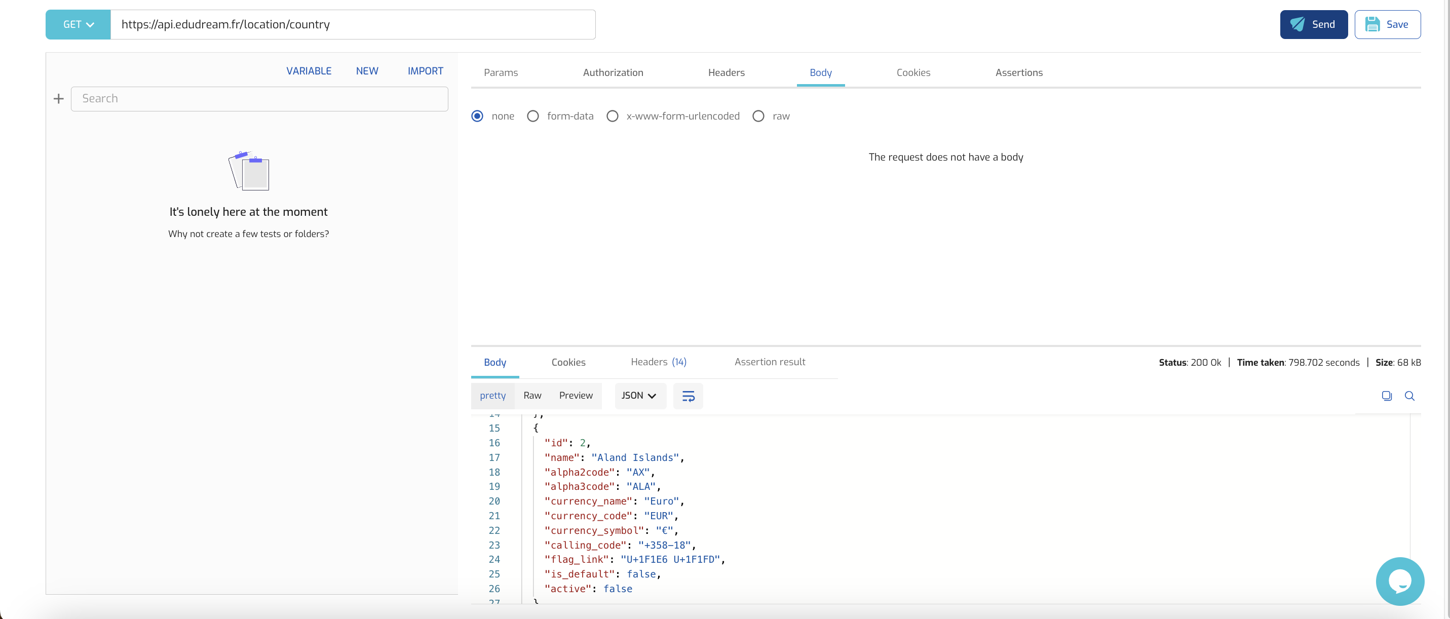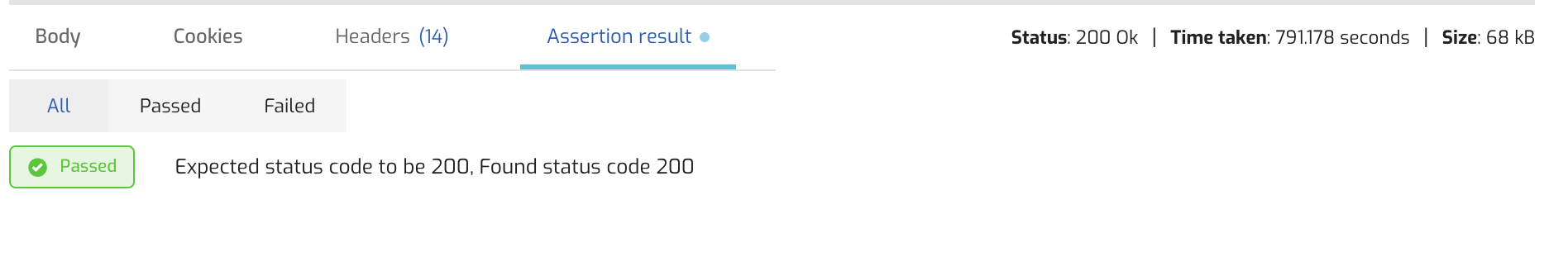 This tab shows you the status code, the duration of the request, the size of the response and the content of the response. You can view the body of the response in JSON, look at the headers and also inspect the Assertions Result tab for result of the assertions you added.