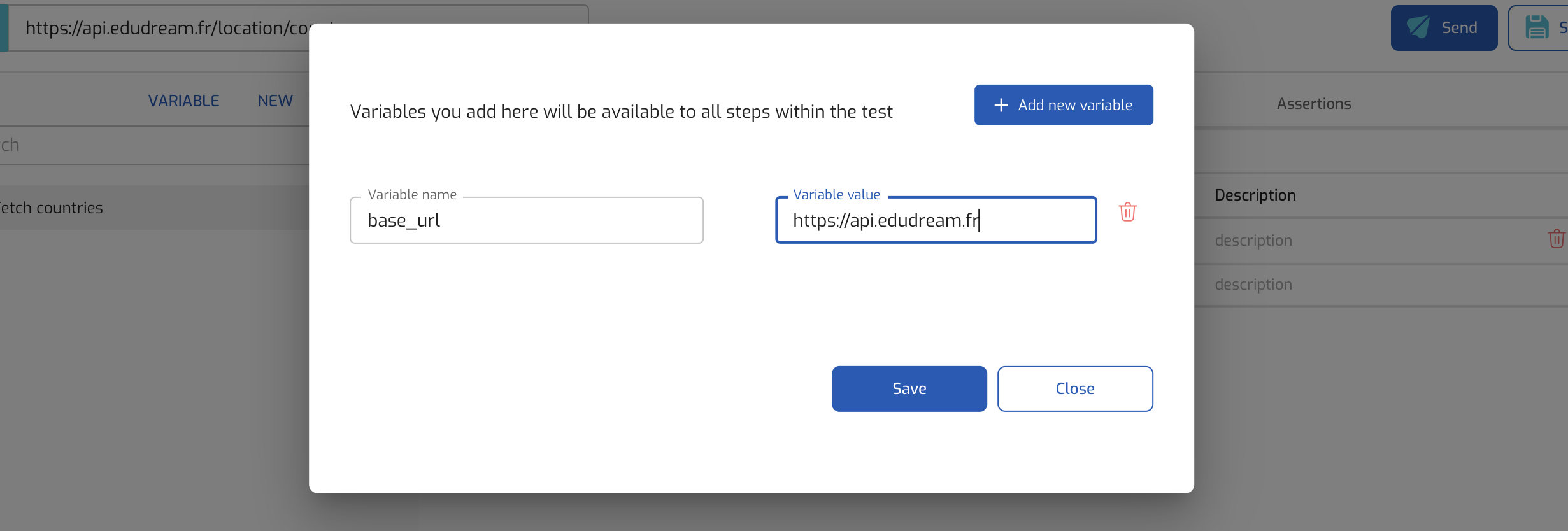 Variables make it easy to reuse a value in multiple API tests. For example, imagine the APIs you are testing have the base url https://example.com/api. This part of the URL is common to all endpoints, such that a login endpoint would like https://example.com/api/login while a registration endpoint would like https://example.com/api/register.